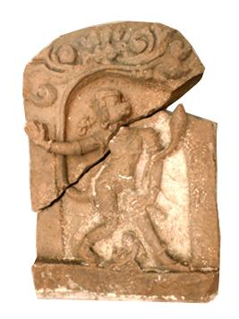 | Description / विवरण | A decorated architectural niche with foliage which shows a two armed standing Hanuman facing right. The right arm is bent backwards while the left arm hangs down. The right arm shows a single wristlet and keyuras on the shoulder. A man kneeling is shown in between the legs of Hanuman. |