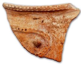 | Description / विवरण | A rim piece of red ware urn with garland design around the neck with loop ends. A prominent projected knob at the centre of the loop on one side. The other end is missing. Pinched design on the everted rim. Thick core. Such decorated urn pots are reported from chalcolithic and megalithic, contexts at Belum cave in Kurnool district, Polakonda in Warangal district and Lingampally in R.R. District respectively. |