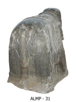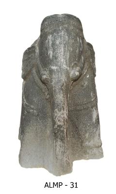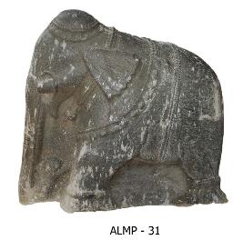 | Description / विवरण | Elephant standing on a pedestal holding a fruit with its trunk. It is decorated with a lace around the temples and a strap with a bell tied at the bottom round the neck. Another strap with bells hanging passing around the back and the fore legs, and a strap of two bands tied around the middle of the body and a weavy design over the ears. The front portion of the pedestal is slightly mutilated. Beaded bands around the feet are seen. |