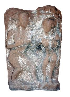 | Description / विवरण | Standing male and female figures in tribhanga posture mithuna . The male has kept his left hand on the shoulder of the female. Iconographical features are worn out. |