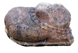 | Description / विवरण | Nandi seated with a thick garland of bells. Head is broken and missing. |