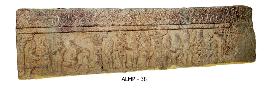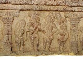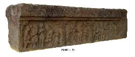 | Description / विवरण | A narrative panel with three registers each one is separated by a pilaster motif. The first one shows a fighting scene in which some ladies are involved. The second one shows a couple attended by a servant maids and in the third one, there are eight human figures in action, piled up one over the other. |