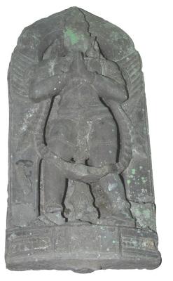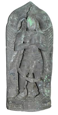 | Description / विवरण | Garuda standing with hands folded in anjali-mudra. He wears a long garland which runs around the whole image falling as far down as the knees. He wears a short head gear. He is adorned with other usual ornaments. The drapery is long lower garment with a central tassel dangling. There is a prabhavali around. |