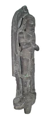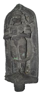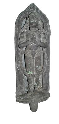 | Description / विवरण | Hanuman standing in samapadasthanaka posture on a decorated pedestal. He is in anjali-mudra. He wears purnoruka tied with multiple folds of waist-band with a long tassel hanging between the legs, a long hara passing from one shoulder to the other, anklets, pattas, armlets, wristlets, Kanthaharas, bhahuvalayas, tiruchurnaon the fore head, kundalas and conical decorated head cap. The tail with curved end is seen behind the head. Prabhamandala is seen prominently. |