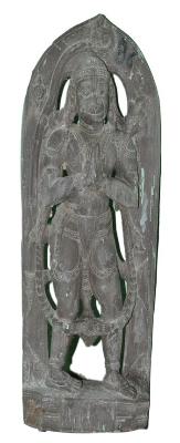 | Description / विवरण | Anjaneya standing in dwibhanga with hands folded in anjali-mudra. He wears a long garland which runs around the whole image falling as far down as the knees. He wears a short head gear. He is adorned with other usual ornaments. The drapery is long lower garment with a central tassel dangling. The tail is curled up to the apex on the top. There is a prabhavali around. |