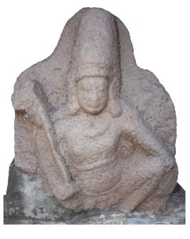 | Description / विवरण | A seated image of Chandisvara or Lakulisa holding staff. He wears jatamakuta and long flowing kundalas in the ears. Necklace and Udarabandha are faintly seen. Right hand holds a staff while the left hand rests on the knee. |