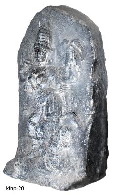 | Description / विवरण | Mahishasuramardini standing in tribangha posture. Goddess tramples Mahisha mutilated keeping her right leg on the hind part of animal piercing trident with her right fore hand mutilated . She is dragging the right hand of Mahisha with her left hand, who is emerging out of the animal and giving fight against goddess with his raised right hand holding a sword. The weapons holding in her upper two hands are broken and missing. She wears high karandamakuta, patrakundalas, kanthahara long necklace hanging over the breast, jewelled and looped mekhala, keyuras, and wrist-bands. She has round face, wide thin lips, long snubbed nose, slightly bulged eyes, thick eyebrows and fleshy cheeks. The sculpture is mutilated. |