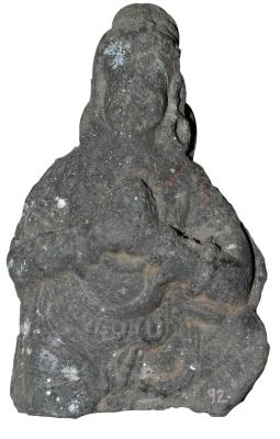 | Description / विवरण | Broken sculpture of a devotee seated in lalitasana posture in anjali-mudra. His combed hair is drawn upwards and made into circular top bun. He wears big circular kundalas, wristlets, yajnopavita and purnoruka tied with waist-band decorated with loop designs. Features abraded. |
