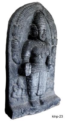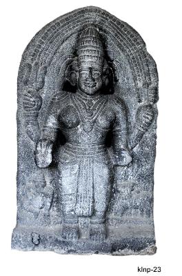 | Description / विवरण | Parvati standing in samapada sthanaka posture. She is represented with four hands. She holds trisula and damaru in her upper right and left hands respectively. Her lower right hand is in abhaya-mudra and lower left hand holds akshamala broken . She wears high karandamakuta, kundalas, Kanthaharas, purnoruka tied with waist-bands and a long folded tassel hanging between the legs, anklets, armlets and wrist-bands. She has oval face, thick lips, almond shaped eyes, pointed chin, long snubbed nose and fleshy cheeks. Figures of Ganesa and Nandi facing right, are shown on the right and left corners of the sculpture respectively. Ornamental prabhavali behind the head is shown prominently. |
