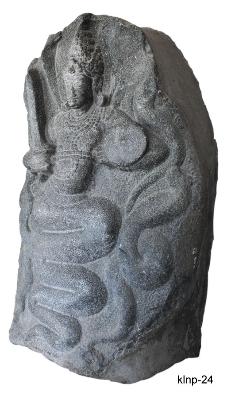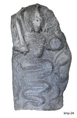 | Description / विवरण | Naga with half human and half serpentine body holds shield in his left hand and sword in his right raised hand. Coiled tail is delineated very meticulously. There are a pair of coiled serpents on either side of the panel. He wears karandamakuta, kanthaharas, chest-band, two stranded beaded yajnopavita, kundalas and bhujakiritis. He has oval face, thick wide lips, long snubbed nose mutilated , lenticular eyes, pointed chin and fleshy cheeks. |