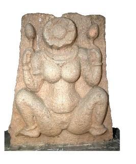 | Description / विवरण | Seated image of Lajja Gauri. Head is replaced by circular lotus moulding. Legs kept open wide apart exposing the private parts. The two hands raised upwards holding lotus buds with stalks. She is decorated with kanthamalas and necklace below the neck. Hands and feet are adorned with armlet and anklets. |