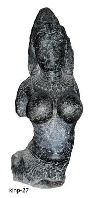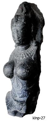 | Description / विवरण | A broken sculpture of female, the lower portion below the waist and hands are broken and missing. She is shown with round breast prominently. She wears jewelled kanthaharas, decorated jewelled waist-band, a long necklace hanging upto nave with a pendent hanging between her breasts, which is tied with a pair of beaded bands on either side, patrakundalas and bhujakirthis. She wears short ornamental karandamakuta. |