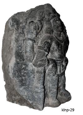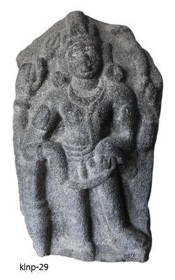 | Description / विवरण | Siva as Lakulisa standing semi nakedly in dwibhanga posture. He is represented with four hands. He holds trident in his right hand and naga in his left hand. His folded right hand kept on the mace and holds indistinct object in his left hand and kept at the waist. He wears karandamakuta with hair locks flowing on the shoulders, patrakundalas, kanthahara, yajnopavita, nagakeyuras, wrist-bands, waist-band with a hanging tassel flowing across the thighs. He has oval face, thick lips, slightly protruded eyes, broad chin and fleshy cheeks. |