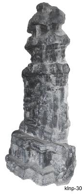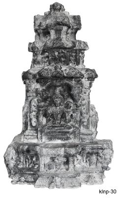 | Description / विवरण | Kosthapanjarawith three tiers and a pedestal. The ornamental pedestal shows a seated Nandi facing left at the centre. The first tier has on ornamental central niche decorated with a torana supported by pilasters. Inside the niche is figure sculpture of seated Uma Maheswara flanked by attendents holding chamaras. He is seated in padmasana posture on a lotus pedestal. He placed his left hand over the left shoulder of Devi in embrace and placed his right hand in abhaya-mudra. Devi placed her right hand over the shoulder of Deva in embrace and holds padma in her left hand. They are richly decked in ornamentation. The second tier shows a central niche with a figure of Mahishasuramardini not clear flanked by a rishi in anjali-mudra and attendents. The third tier has a empty niche. |