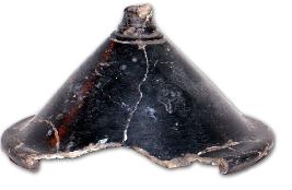 | Description / विवरण | Highly polished black ware lid with broken handle and knob, concentric circles prominently seen at the base of handle, incurved projected rim at its base. |