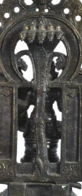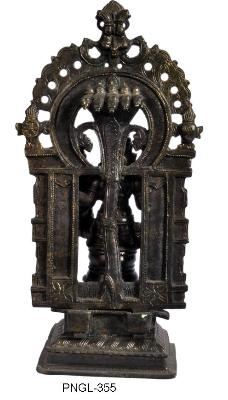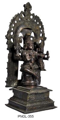 | Description / विवरण | Lakshmi Narayana seated in ardhaparyankasana posture on a circular pedestal over a square pitha. He holds chakra in his upper right hand and kept his lower right hand in abhayamudra. Sankha in his upper left hand. His lower left hand placed over the shoulder of Lakshmi as in embrance. Devi is seated on the left lap of Deva. She holds padma in her left hand, while her right hand placed on back of Deva as in embrace. He wears decorated kiritamakuta, kanthahara, long necklace hanging between the breasts and tied laterally on both sides and knotted on the back, patrakundalas, purnoruka tied with jewelled waist-band, bhahuvalayas, anklets, wristlets, ringlets to thumb, beaded pattas below the ankles. He has round face, long snubbed nose, thick lips, open eyes and fleshy cheeks. Devi is also richly ornamented with kiritamakuta, purnoruka, haras, anklets, wrist-bands etc. There is decorated prabhamandala depicted with kirtimukha at the top and a motif of Garuda at its base. On the back side of the icon is a five hooded naga with its coiled tail rested on the pedestal. |