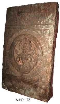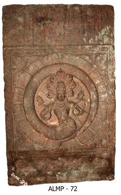 | Description / विवरण | Naga Half human and half serpent in a circle formed out of its tail. He holds lotus buds with his two hands. Seven hoods are seen over his head. He wears ornamental jatamakuta, tight kanthahara, beaded kanthamala, kundalas, beaded yajnopavita and waist-band with a knot. He has oval face, long stout nose, slightly bulged eyes, thick lower lip and fleshy cheecks. The entire panel is placed at the centre of a full blossomed lotus. |