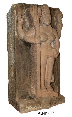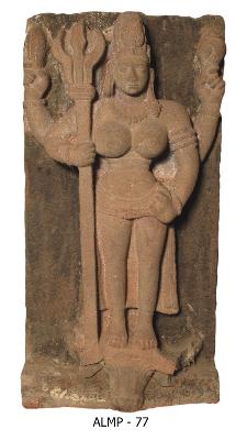 | Description / विवरण | Chaturbhuja Mahishasuramardini standing in samabhanga sthanaka posture over the head of Mahisha. She holds a trident having a long shaft in her fore left hand and her right hand kept in katihasta posture. Sankha and lotus bud are in her rear hands. She wears jatamakuta, sankha and patra kundalas in the right ear and makarakundala in the left ear and a hara around the neck, waistband, beaded girdle, coiled armelts, beaded wristlet, purnoruka with folded tassels on either side. |