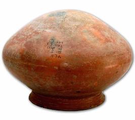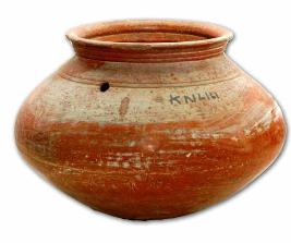 | Description / विवरण | Polished red ware pot with convex body and sagger base, splayed out rim, concentric lines below the neck, a pair of deep grooves at the shoulder, graffiti mark at the shoulder. |