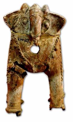 | Description / विवरण | Four legged elephant shaped sarcophagus in red ware, with circular opening below the trunk and also at the hind portion, it shows prominent elephant head with head gear and trunk broken, extended ear lobes, protruding eye balls, it is decorated with a chain of hanging bells at the neck, hind legs, front legs and body. |
