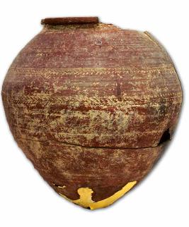 | Description / विवरण | Broken red ware pyriform shaped urn pot with thick splayed out rim, pointed base, a pair of chevourn designs on the shoulder and the body, multiple grooves below the neck. |