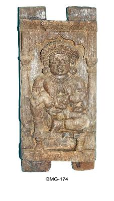| Description / विवरण | it is a panel sculpture part of Chariot made of wood, female sitting in the harth prayangasana style,teeth is very akora styles. she is having a jata makuta,give a milk in baby. it may be tadagi and krishna childhood story. |