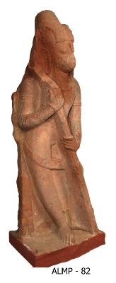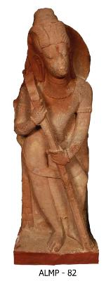 | Description / विवरण | Daksha standing in dwibhanga posture holding a long staff slightly broken . He is depicted with the face of a goat having a headgear in the shape of a jatamakuta and long protruding ear lobes. On either side of the forehead are two curved horns. He wears beaded kanthahara, armlets, wristlets, waist-band with hanging central arch shaped tassel. Top right side of the panel is broken. |