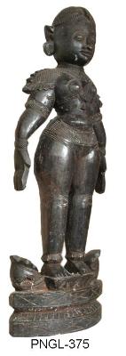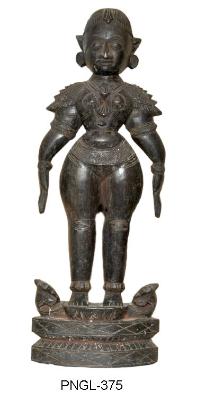 | Description / विवरण | Female warrior with good physique body standing on double lotus pedestal with a pair of projected petals on either side. She is standing in sampada sthanaka posture holding slightly curved swords ends broken with her hands. She wears kankanas, knee caps, ornamental waist girdle with hanging beaded band, short ardhoruka, shoulder shieds, kanthahara a long hara hanging over the breast with a vertical pendent, slightly projected earlobes with kundalas. She wears a skull cap with hanging pendent on the fore head. She has round face, long pointed nose, thick lower lip, half closed eyes, thick eye brows, vertical tilaka on the forehead. |