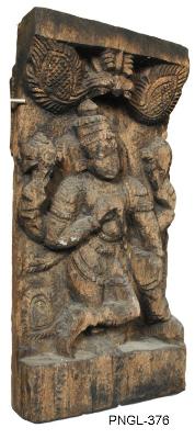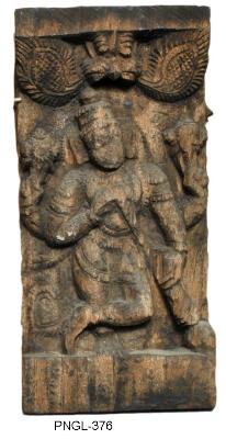 | Description / विवरण | Vaishnavate dwarapala standing in dwibhanga posture holding sankha and chakra in his right and left upper hands respectively. His fore right hand placed on the gada, which is shown on the left side and his fore left hand mutilated . He wears kankanas, wristlets, keyuras, kanthahara, a long hara with circular pedent, purnrouka tied with decorated waist-band and tiered head gear. Facial features abraded. Over the head there is an elaborate kirthimukha with leaf shaped foliage on either side. |