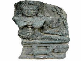 | Description / विवरण | Seated image of Chamundi, one of the saptamatrika deities. She is seated in virasana posture with left leg bent inwards while the right leg broken. The visible left hand holds the trident. The head is adorned with jatamakuta surmounted by a skull on the top and the hair done into jatas falling on either side. There is head band over the forehead. The ears are ornamented with patra and makarakundalas. There is beaded necklace around the kantha below which is a long yajnopavita in three strands containing skulls. Also there is katisutra around the thigh. She is dressed in short lower garment and a kuchabandha on the breasts. The arms are decorated with serpent hooded keyuras, armlets, bangles and wristlets. Below the pitha is the vehicle jackal with human head. |