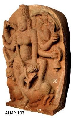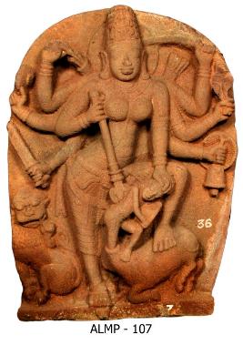| Description / विवरण | Astabhuja Mahishasuramardini standing with her right leg on the body of the Mahisha and the left leg kept firmly on the ground. She is shown trampling Mahisha who is emerging out of the animal with the trident holding with her fore right hand and her fore left hand placed on the head of Mahisha. She holds khadga, snake, ghanta bell attached to a shield with her left rear hands and arrow, sankha and sword with her right rear hands. A pair of quiers are seen on back side of the shoulders. She has a sharp features with long nose, thick lower lip and broad eyes. She wears a long bindi on the forehead, kiritamakuta, oranamental broad hara, yajnopavita, makara kundalas, keyuras, wrist bands, mekhala with hanging tassels of drapery and kankanas. Her Vahana, lion is seen at the bottom on the right side. Halo is shown prominently behind the head. |