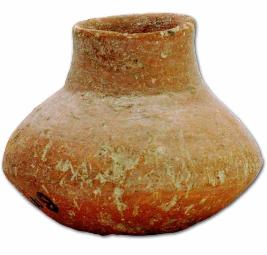 | Description / विवरण | Red ware pot with straight high neck and round base, blunt thickened featureless rim. |