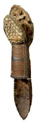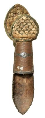 | Description / विवरण | Hand-Armour with flexible scale designed leather glouses stitched at the flat end. Externally it is decorated with wavy and pyramid shape design all along the periphery. |