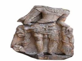 | Description / विवरण | Broken image of dwarapalaka. Head mutilated. Only the torso and lower parts are available. There are necklaces above the chest, besides yajnopavita and udarabandha. The lower part of the right hand is broken while the left hand rests on the mace. Drapery contains a lower garment in three straps with the long flowing tassel in the middle. In the bottom on the left side is monkey holding a baby. Lean in proportion. Seems to be of Rashtrakuta School of Art. |