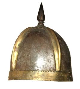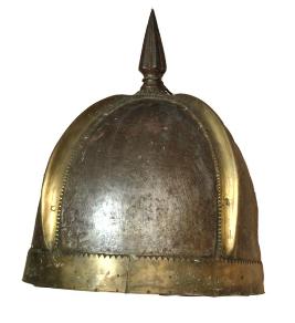 | Description / विवरण | Helmet with domical body and a spike which looks like a spear head on the top. A circular pattais given all around at its crescentic shape base for reinforcement. Four thick crescentic shape pattas are luted to domical body as on ornamental devices. |