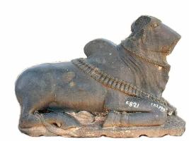| Description / विवरण | Nandi to the right with the forehead turned towards left. It has a smooth glazy polish with prominent hump. The two fore legs turned inwards so as to touch the hind ones. There is a garland of bells on the back with a tongue in each and hook on the top. |