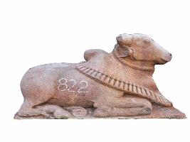 | Description / विवरण | Nandi seated to the right with the fore legs bent inwards prominently. The ear part is chipped off. There is a garland of bells across the hump and neck, belt made of rope. A decorated band is shown on its forehead. |