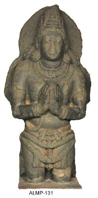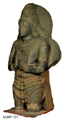 | Description / विवरण | Garuda standing in anjali-mudra. Both wings are broken. He has oval face, bulged eyes, long nose, thick lower lip, Vritha kundalas, halo on the back side of the head, multiple haras, katibandha, katisutra, adhorukha tied with waist-band and tassels dangling between the legs, hair locks flowing over the shoulders, yajnopavita and wrist-bands. The lower portion below the knees is broken and missing |