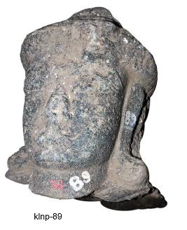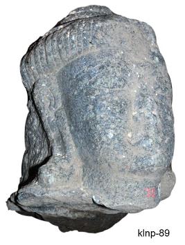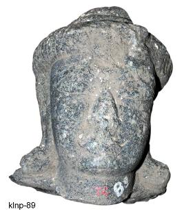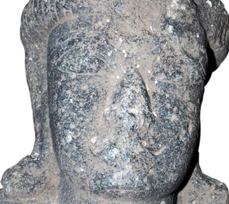 Broken head of human figure. The lower portion below the neck is broken and missing. It has slightly square face, thick lips, long ear lobes, long snubbed nose, almond shaped eyes and thick eyebrows. His combed hair is drawn upwards and made into small bun on the top at the centre. He wears kundalas.