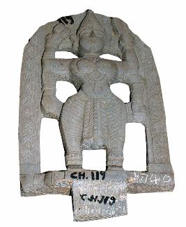 | Description / विवरण | A deity standing with four hands, the headdress is kiritamakuta, the two rear hands hold damaru and trident while front two hands are in abhaya and varada-mudras. Adorned with garland like hara, anklets and wristlets. Around the loin is ardhoruka with folds and central tassel in the middle. |