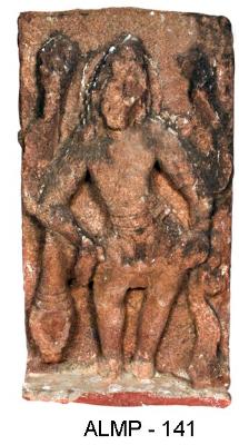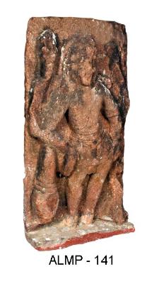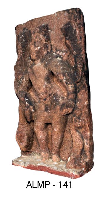 Dwarapala standing in dwibhanga posture. He is represented with four hands. He holds trisula and damaru in his right and left upper hands respectively. A mace gada in his right lower hand and placed his left hand on the waist. A snake standing on its tail with raised hood facing left is seen prominently on the left side of the panel. He wears yajnopavita, kanthaharas, waist-band, armlets, anklets, wristlets and karandamakuta. Features abraded.