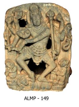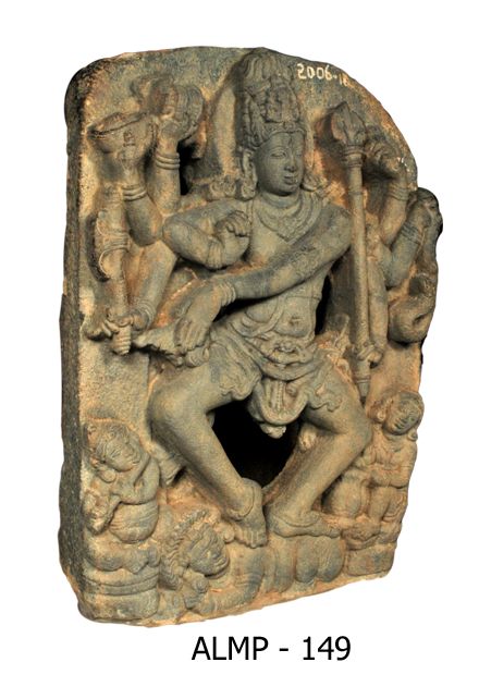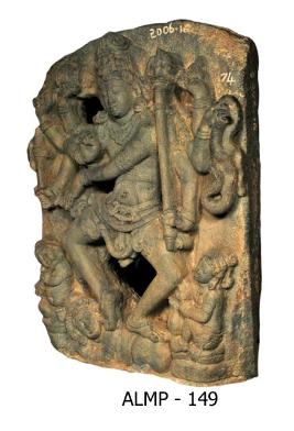 Siva as Nataraja with his legs bent and kept wide apart standing on a human figure apasmarapurusha . He carriers a battle-axe, a bowl, damaru, sula, agni and snake, while the front right hand kept in vyakhana or chinmudra and the left hand crossing to the right side across the chest and kept as gajahasta. He wears ornamental jatamakuta, kanthamala, hara, armlets, wrist-bands, chest-band, yajnopavita,anklets, ardhoruka tied with ornamental mekhala and kundalas. He has thick lower lip, long snubbed nose, half closed eyes, thick eyebrows and fleshy cheeks. Halo is seen prominently. There are musicians playing flute and drums on either side at the lower portion of the panel.