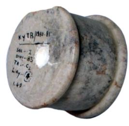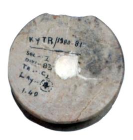 | Description / विवरण | A reel shaped pendent made of sand stone. It has solid body with slightly raised circular ends on either side with a horizaontal perforation. Entire body is well polished. |