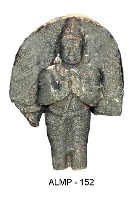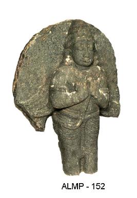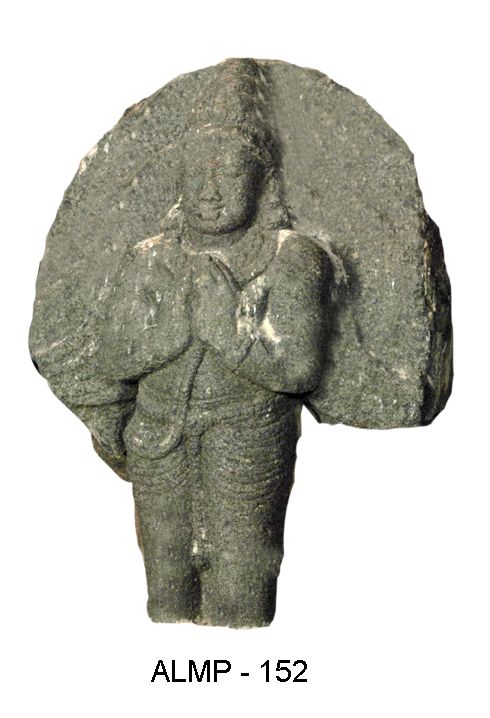 Broken sculpture of Garuda standing in dwibhanga posture in anjali-mudra. Wings are shown prominently on either side. He wears kiritamakuta, kundalas, yajnopavita, wrist-band and ardhoruka tied with waist-band. The lower portion of prabhamandala and legs are broken. He has oval face, long nose, thick lower lip, half closed eyes and fleshy cheeks.