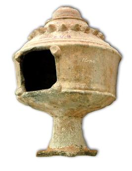 | Description / विवरण | Red ware lamp stand with circular head and square opening at the centre, decorated with pilaster motifs on either side, above the head is a stepped sikhara type of moulding depicted with full blown lotus, followed by deep grooves, above it is a knob with an outlet for smoke. |