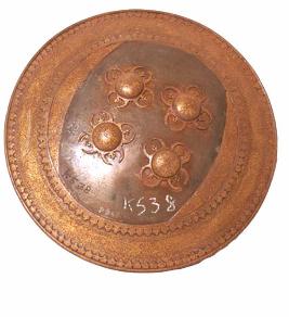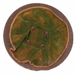 | Description / विवरण | A circular shield with gold decorative border, studded with four gilt bosses on the convex side. Each boss is decorated with trident head symbols on four sides, with damascening inlay work is shown around the border. A small cotton pad is seen on the reverse with four rings for tying purpose. |