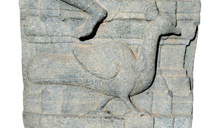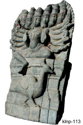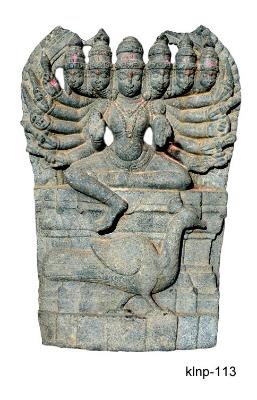 Shanmukha Subrahmanya seated in ardha-prayankasana posture on a ornamental pitha. He is represented with six heads and twelve hands holding different weapons and flora such as trident, sword, knife, thunder bolt, shield, bow, arrow, mace and bell. His front right hand is in abhaya-mudra, whereas his front left hand is in varada-mudra. He wears kanthahara and long hara with a pendent, chest-band, beaded mekhala, wrist-bands and anklets, ardhoruka probably extended upto the knees. Peacock, his vahana is meticulously delineated at the pedestal. Middle portion of prabhamandala over the heads is broken and missing.