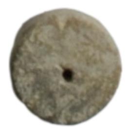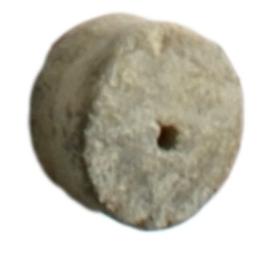 | Description / विवरण | A red ware pendent having thick body with notchat the centre and raised circlets on either end with horizontal perforation. |