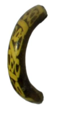 | Description / विवरण | Fragment of black colour bangle with broad upper surface. It is decorated with using spiral design drawn. The space in between the spirals is filled with circles. |