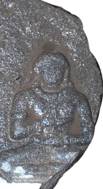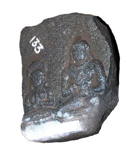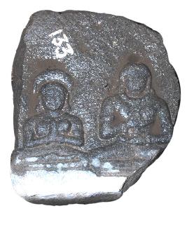 Broken sculptural panel of Dampathi, seated on a common pedestal. The female on the right side is shown seated in padmasana posture in anjali-mudra. She wears kanthahara, kundalas, wristlets and ardhoruka tied with waist-band. Her combed hair is drawn back wards and made into a top bun. The male is also sitting in padmasana posture keeping his right hand in dhyana-mudra, while his left hand kept below the right hand as support. He wears kundalas, kanthahara, armlets, wristlets and ardhoruka tied with waist-band. His combed hair is drawn upwards, sidewards and tied with a band on the forehead. Sculpture on the right side is broken vertically.
